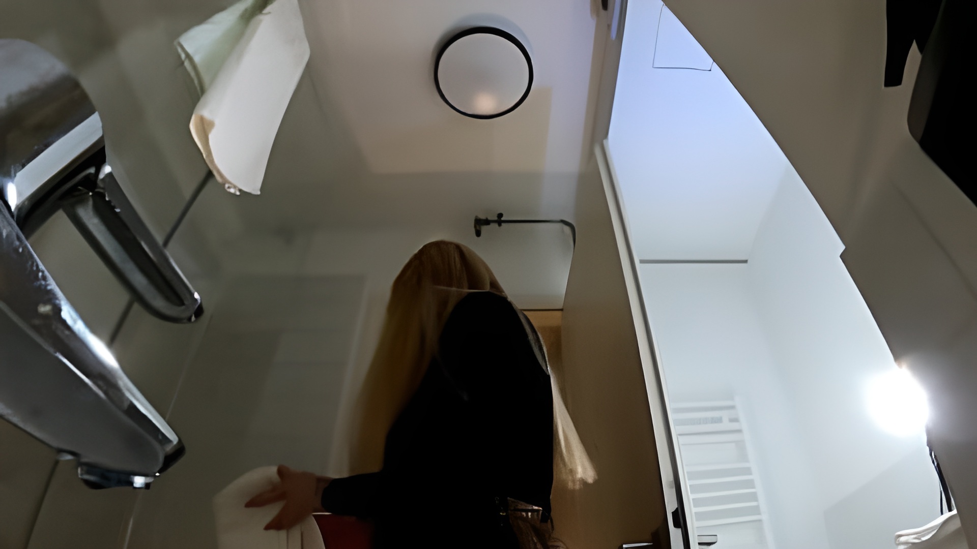 Big Tits Big Ass Hot Blonde Babe in Pantyhose and High Heels with a Miniskirt does a Striptease in the Bathroom