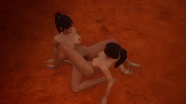 Two sensual ladies lock lips and grind against each other in lesbian scissoring action. They play with each other's big boobs and wet clit rubbing. The cartoonish scene ends with tribbing and a satisfied expression.