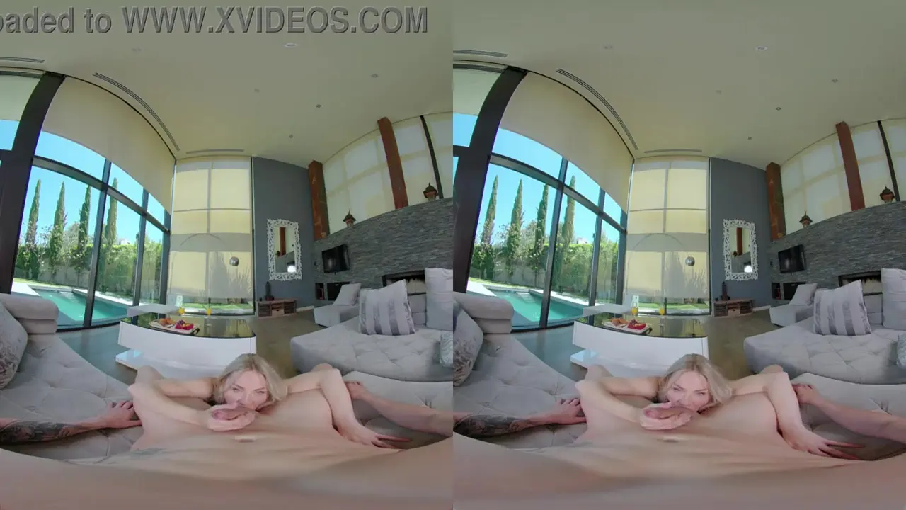 Petite blonde with a tattoo offers her shaved pussy to him in their living room. She gives him a handjob and blowjob before riding him in cowgirl. He pounds her in doggy and missionary before blowing his load on her face.