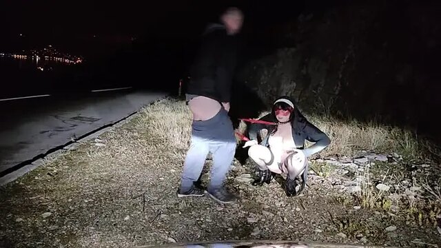 Humiliated slave trainee gets big dick facial on public road