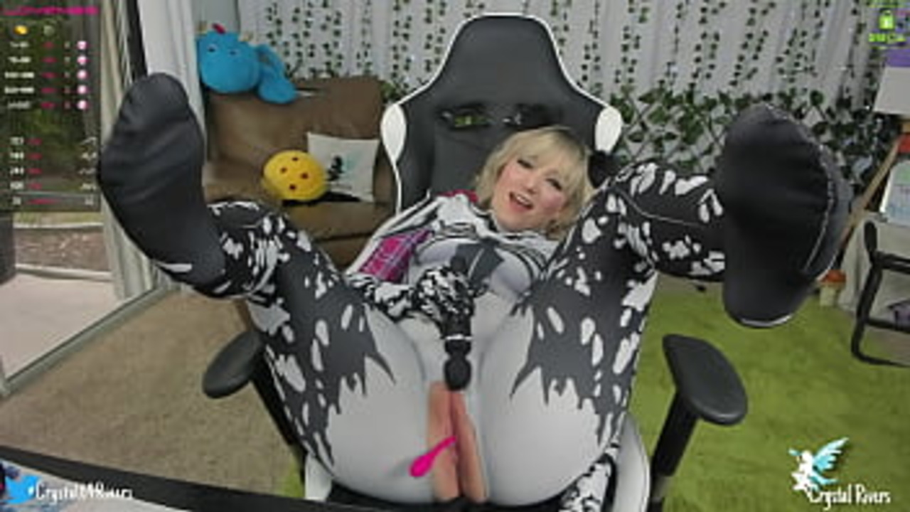 A college cutie in a sexy body suit and big boobs costume takes a huge dildo in her tight ass. She moans as it goes deep, and he gives her a messy cum shot all over her cosplay.